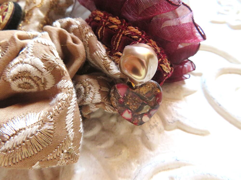 ボタニカル柄のオーガンジーと贅沢な刺繍生地を使用し、海外などで購入してきたボタンやフラワーモチーフをコラージュして制作しました。