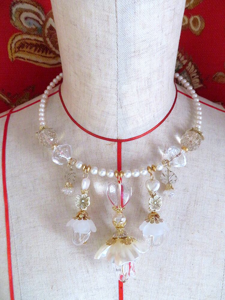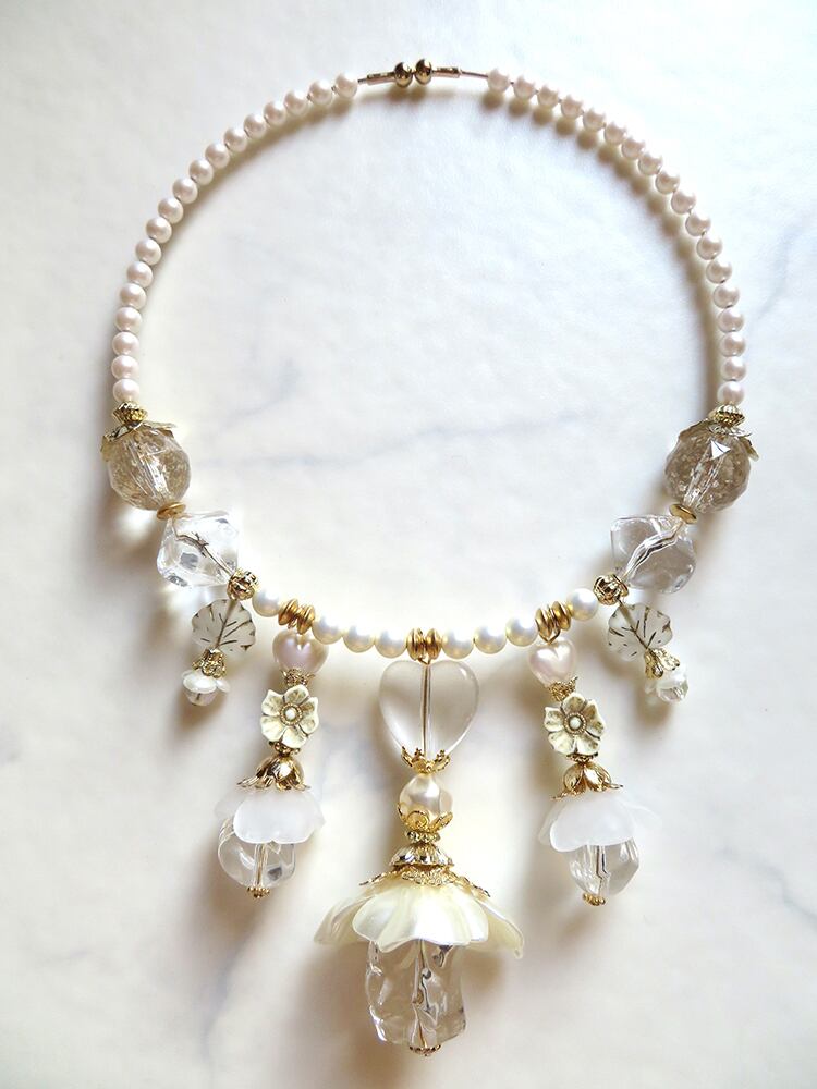 クリアやフロストが美しいドイツビーズをメインに、アクリル、プラ、チェコ硝子、ヴィンテージビーズ等をふんだんに使用し、夏の気分を薄荷水の様に爽やかに盛り上げてくれるクリアデザインを制作しました。