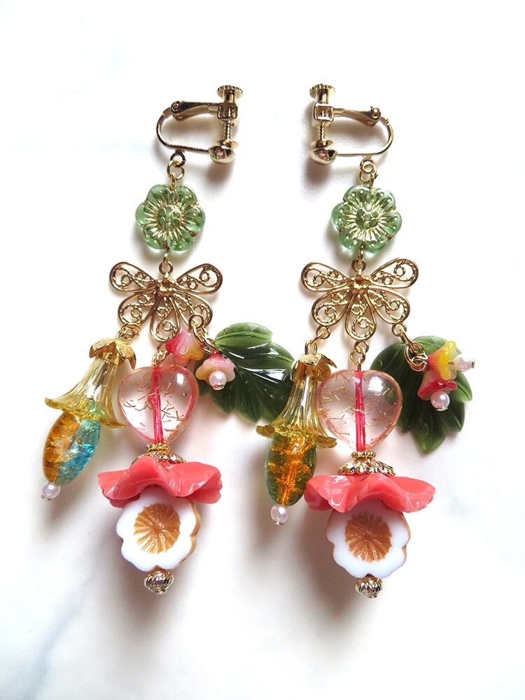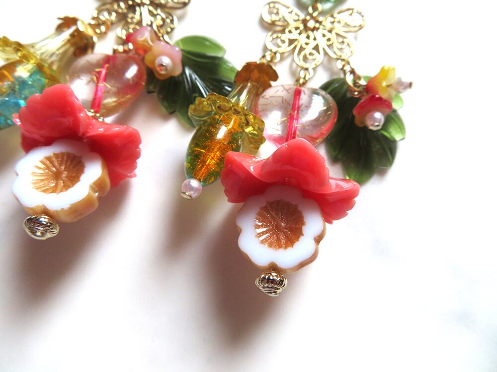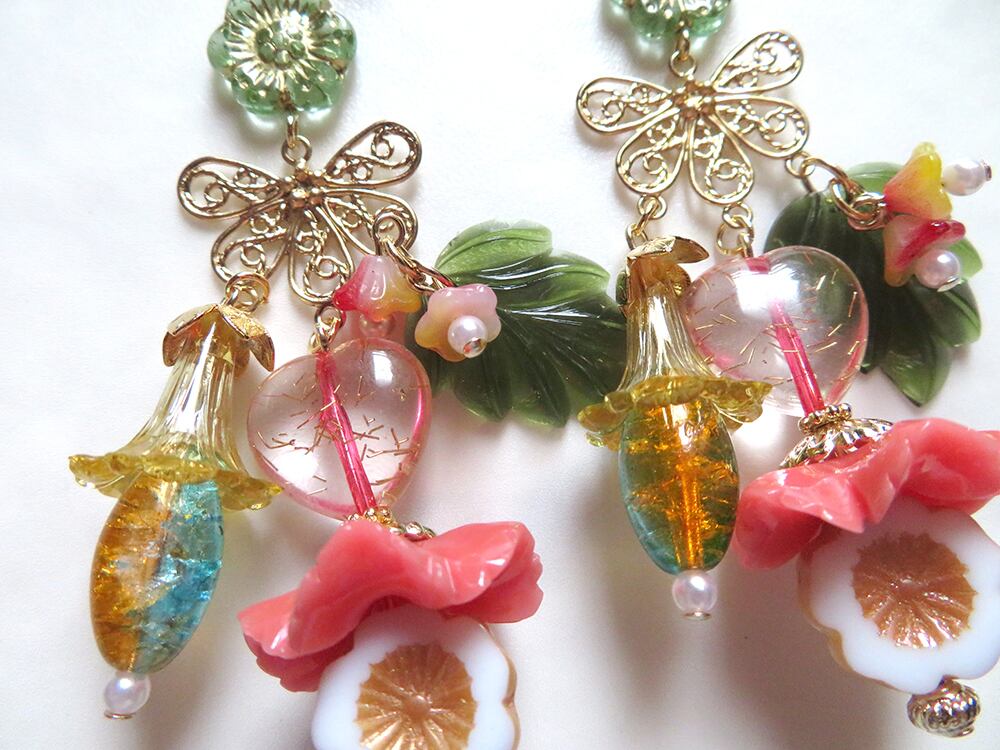 カラフルなアクリルやプラビーズを多用していますが、チープにならない様に差し色のゴールドやチェコ、アメリカのハンドメイドのガラスビーズ等を使用して、大人の女性が気軽に着けられる遊び心あるディテールに仕上げました。
