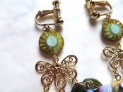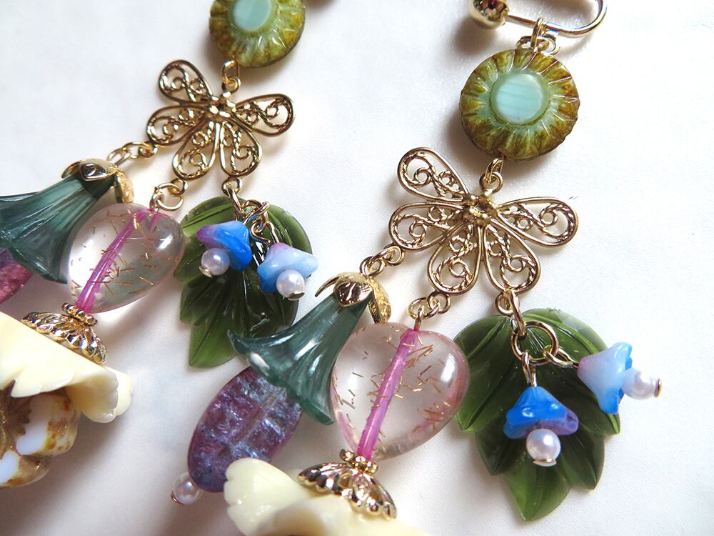 カラフルなアクリルやプラビーズを多用していますが、チープにならない様に差し色のゴールドやチェコ、アメリカのハンドメイドのガラスビーズ等を使用して、大人の女性が気軽に着けられる遊び心あるディテールに仕上げました。