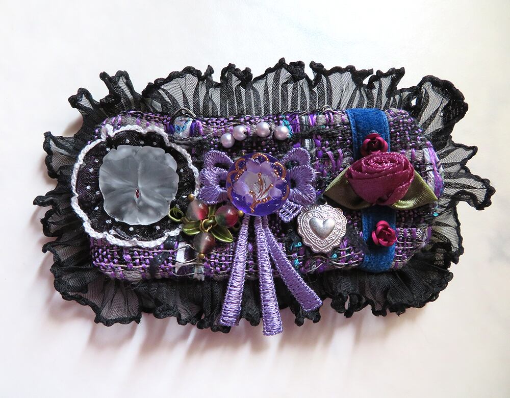 クチュールツイードを使用し、チェコ硝子釦や海外で購入したパーツ等をコラージュしたヘアクリップ。