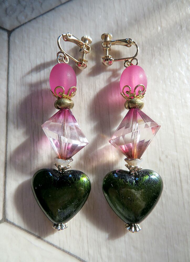 ハートのビーズは黒メタルカラーに抹茶色が塗装されたような色です。