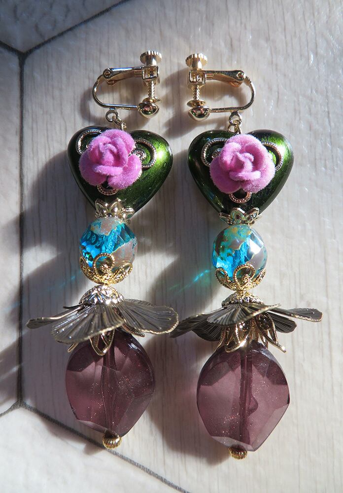 ハートのビーズは黒メタルカラーに抹茶色が塗装されたような色です。