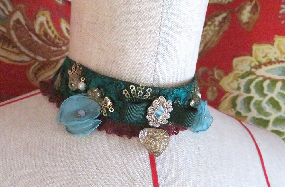 美しい刺繍リボンにビーズやリボン、モチーフを縫いとめたチョーカー。