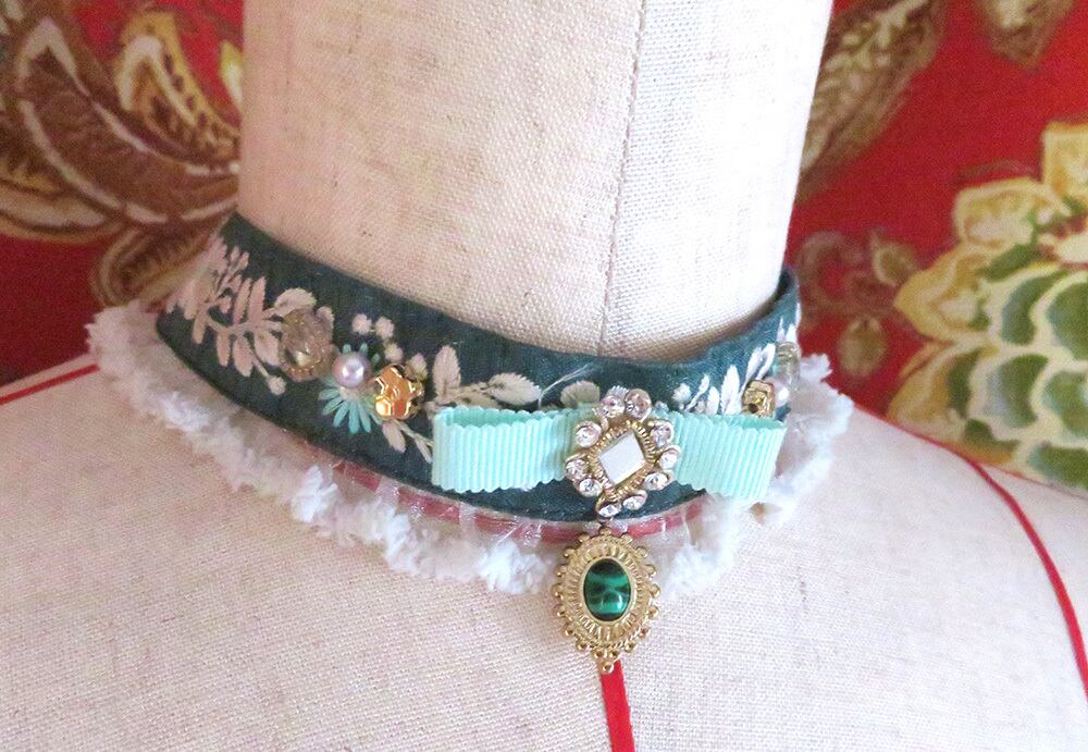 美しい刺繍リボンにビーズやリボン、モチーフを縫いとめたチョーカー。