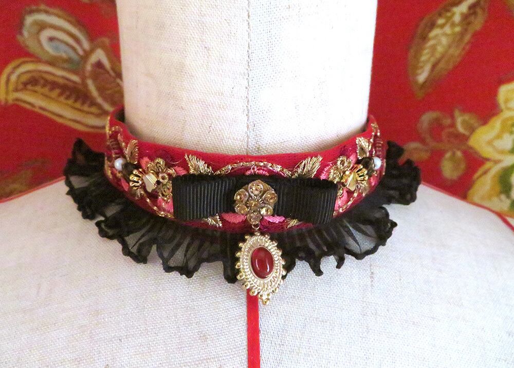美しい刺繍リボンにビーズやリボン、モチーフを縫いとめたチョーカー。