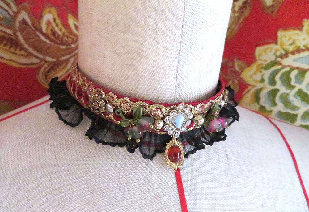 美しい刺繍リボンにビーズやリボン、モチーフを縫いとめたチョーカー。