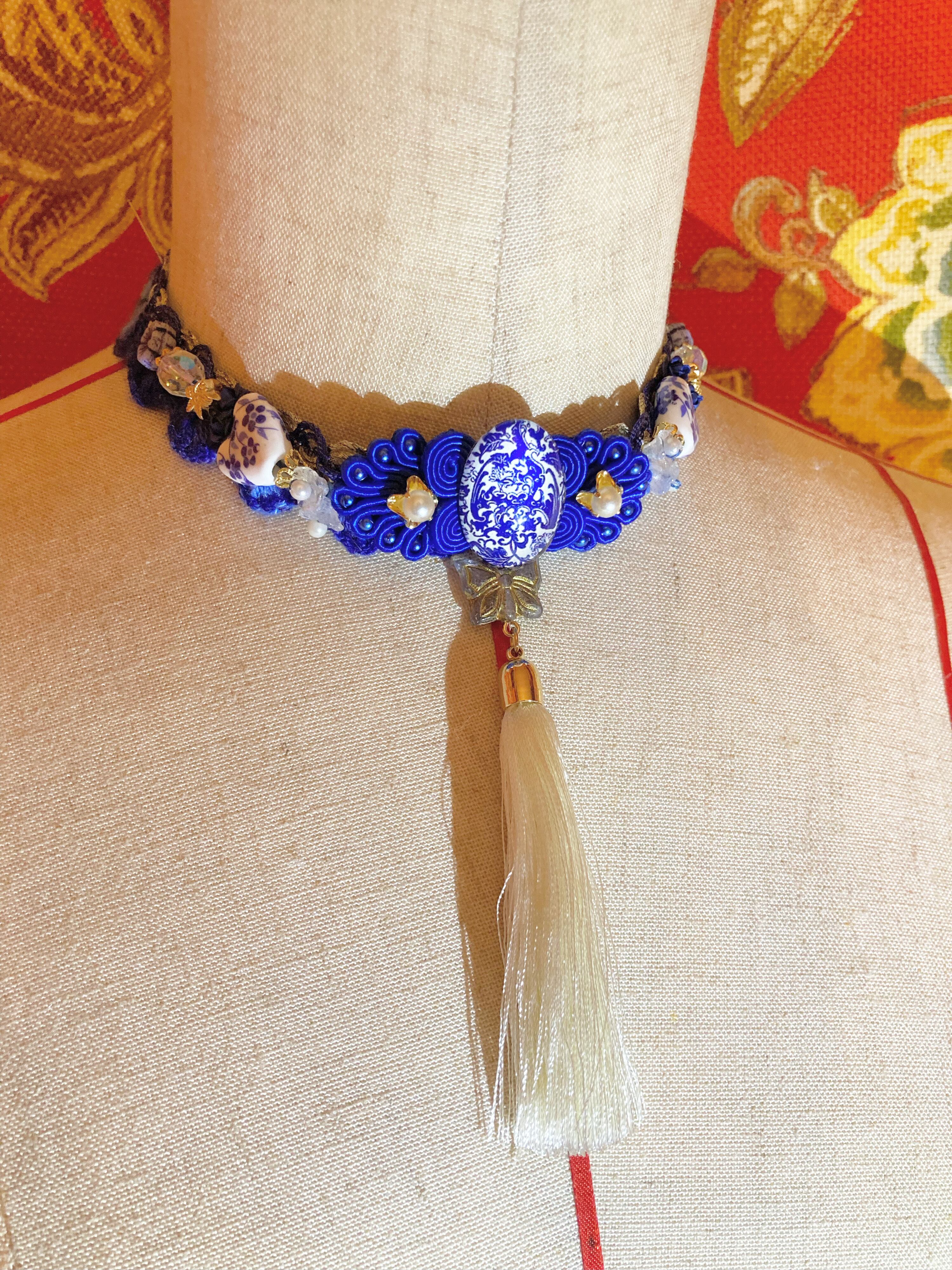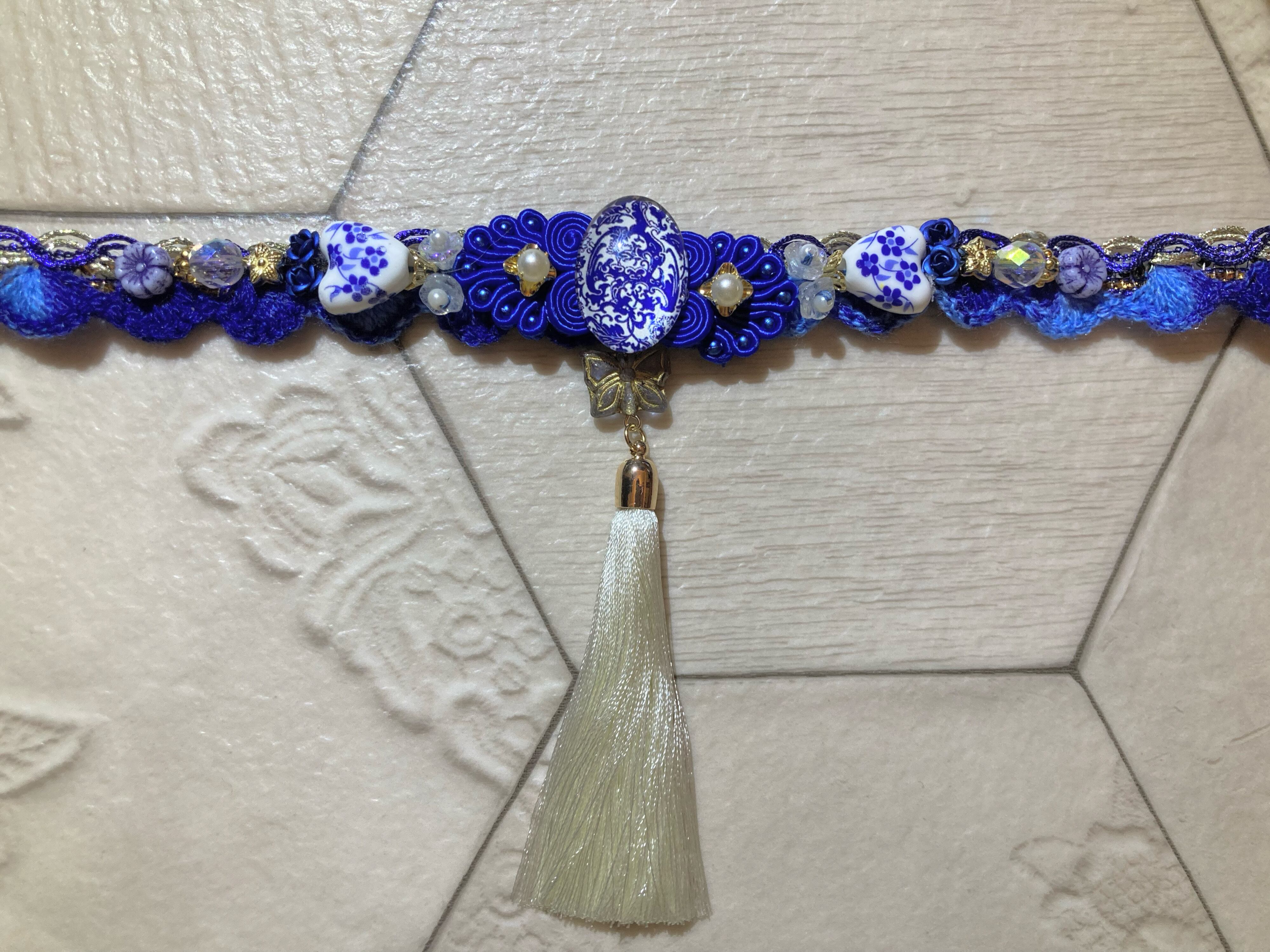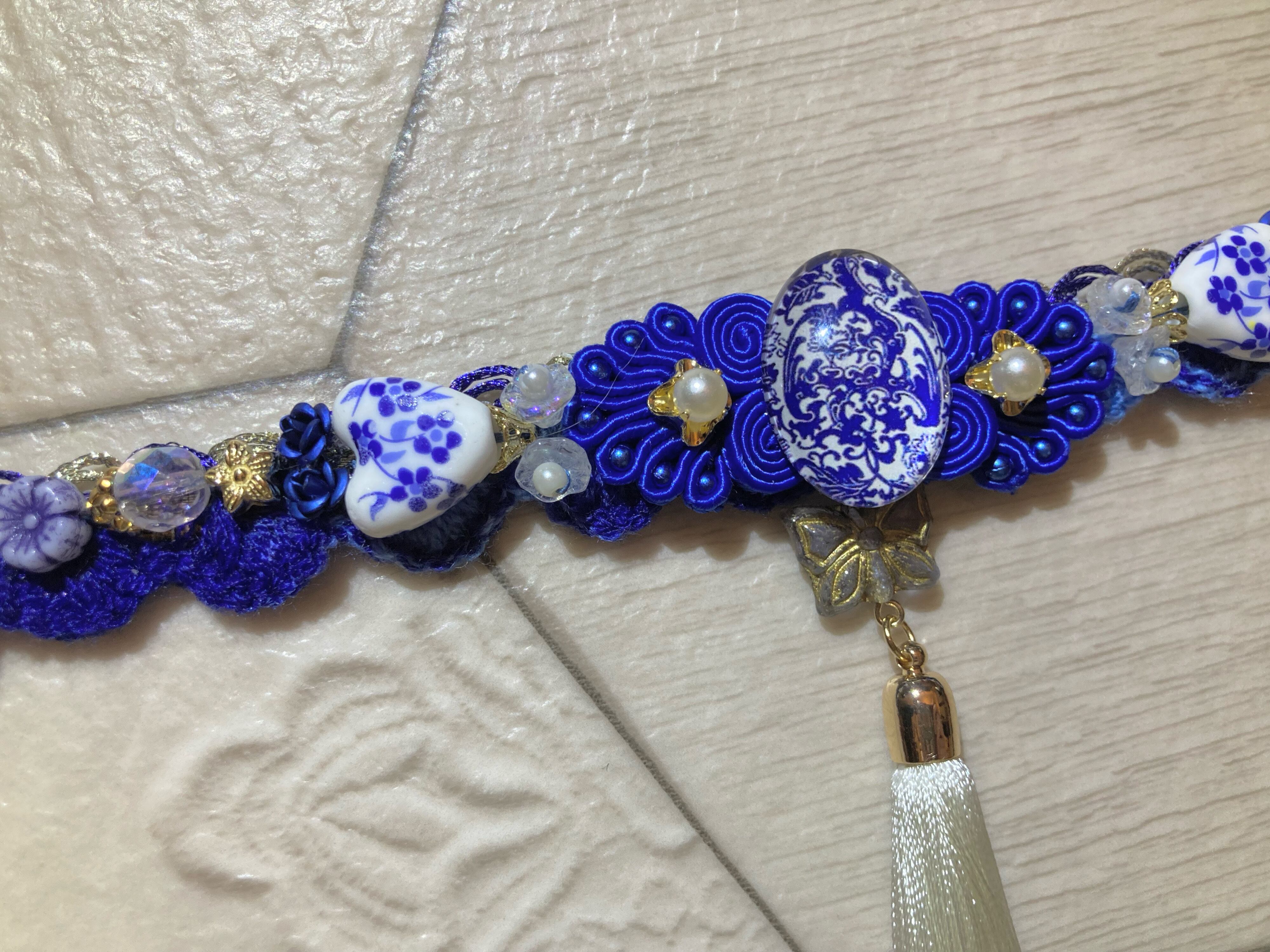 陶器でできたビーズを使用し、珍しい青揃えのデザインで制作しました。