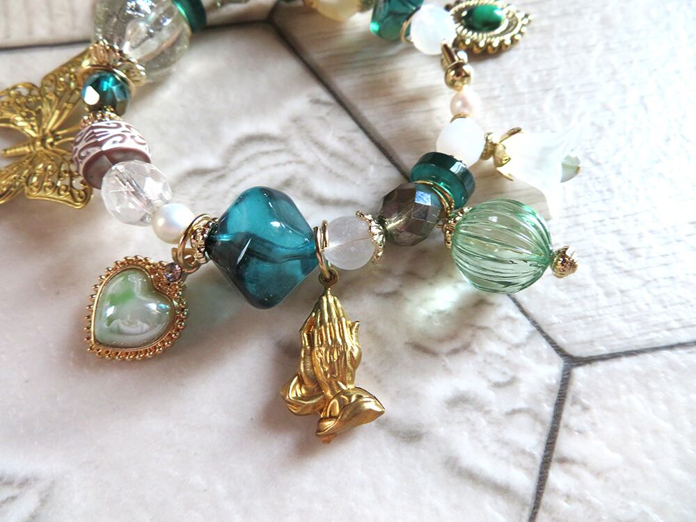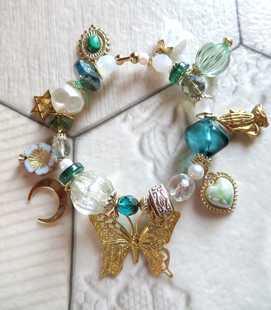 こちらのブレスレットシリーズはおまじないをイメージしたチャーム達を、贅沢に飾りつけたデザイン。全て一点ものとなっております。