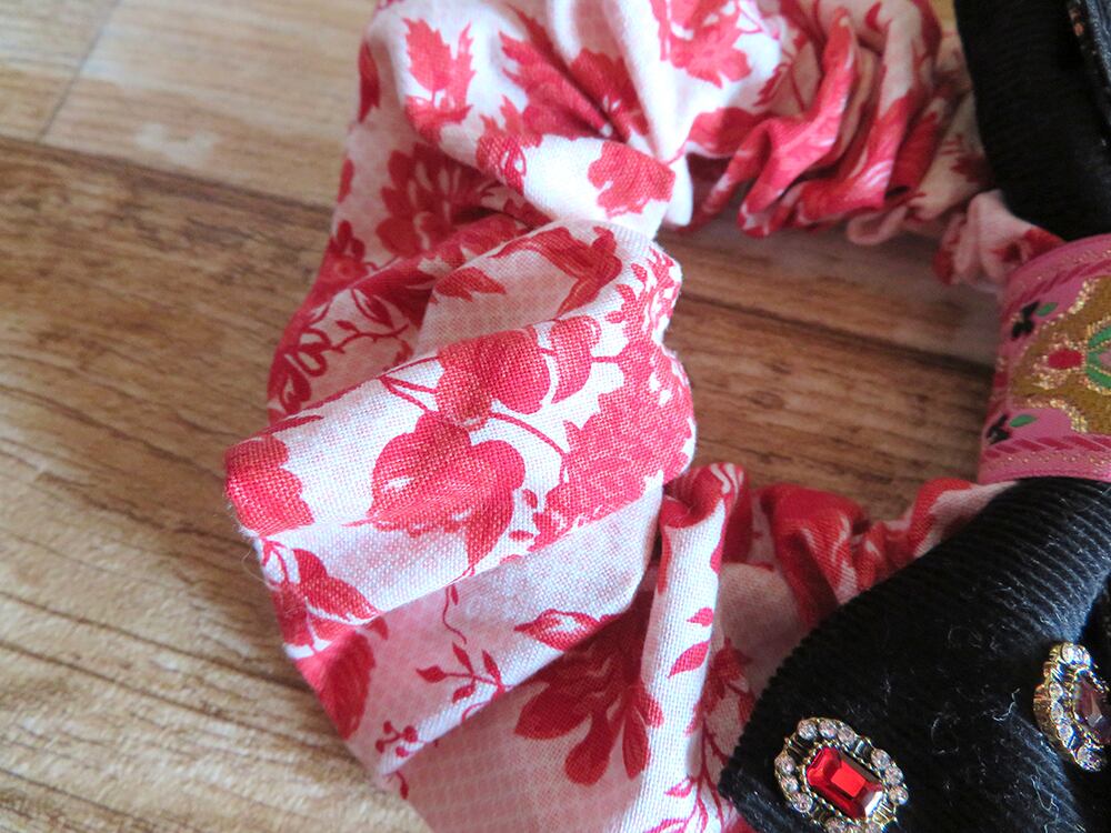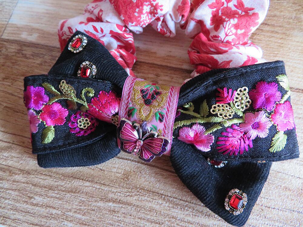 刺繍リボンとジュエルパーツを使用した大きめのりぼんシュシュ。