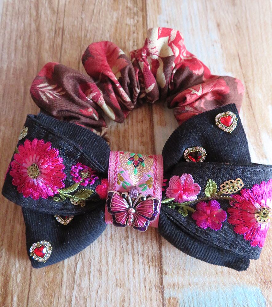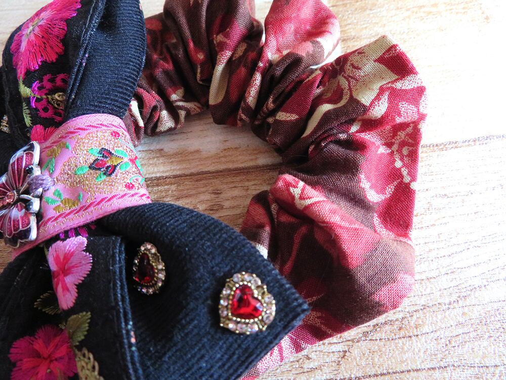 刺繍リボンとジュエルパーツを使用した大きめのりぼんシュシュ。