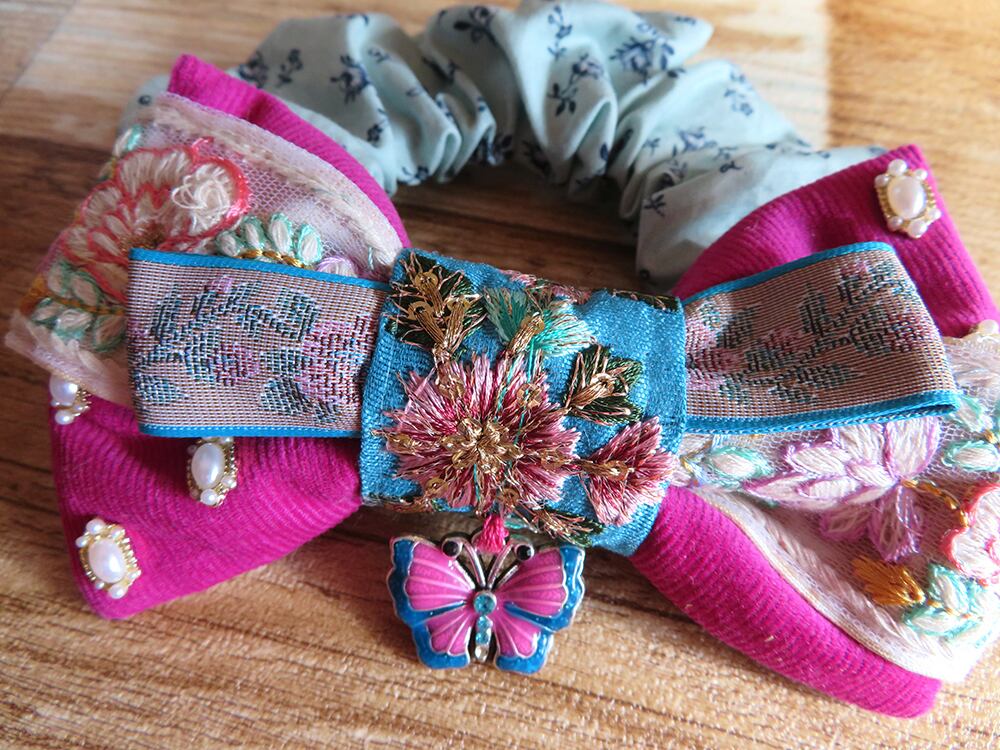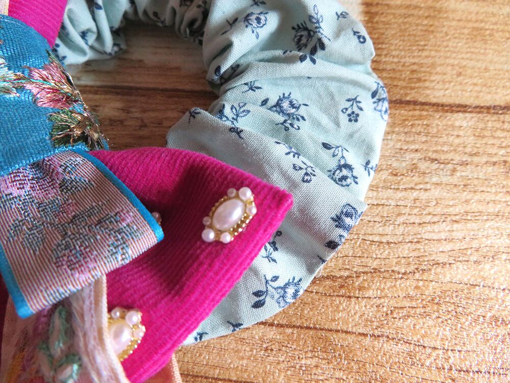 刺繍リボンとジュエルパーツを使用した大きめのりぼんシュシュ。