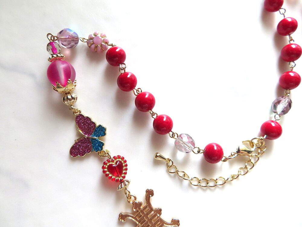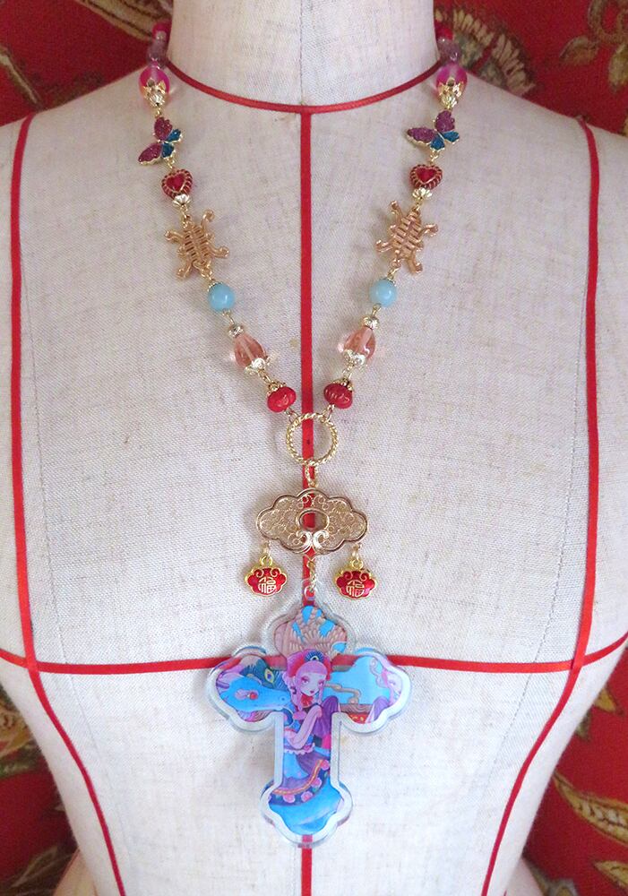 中華柄に合わせてチャイナ風にまとめた珍しいロザリオ風ネックレス。