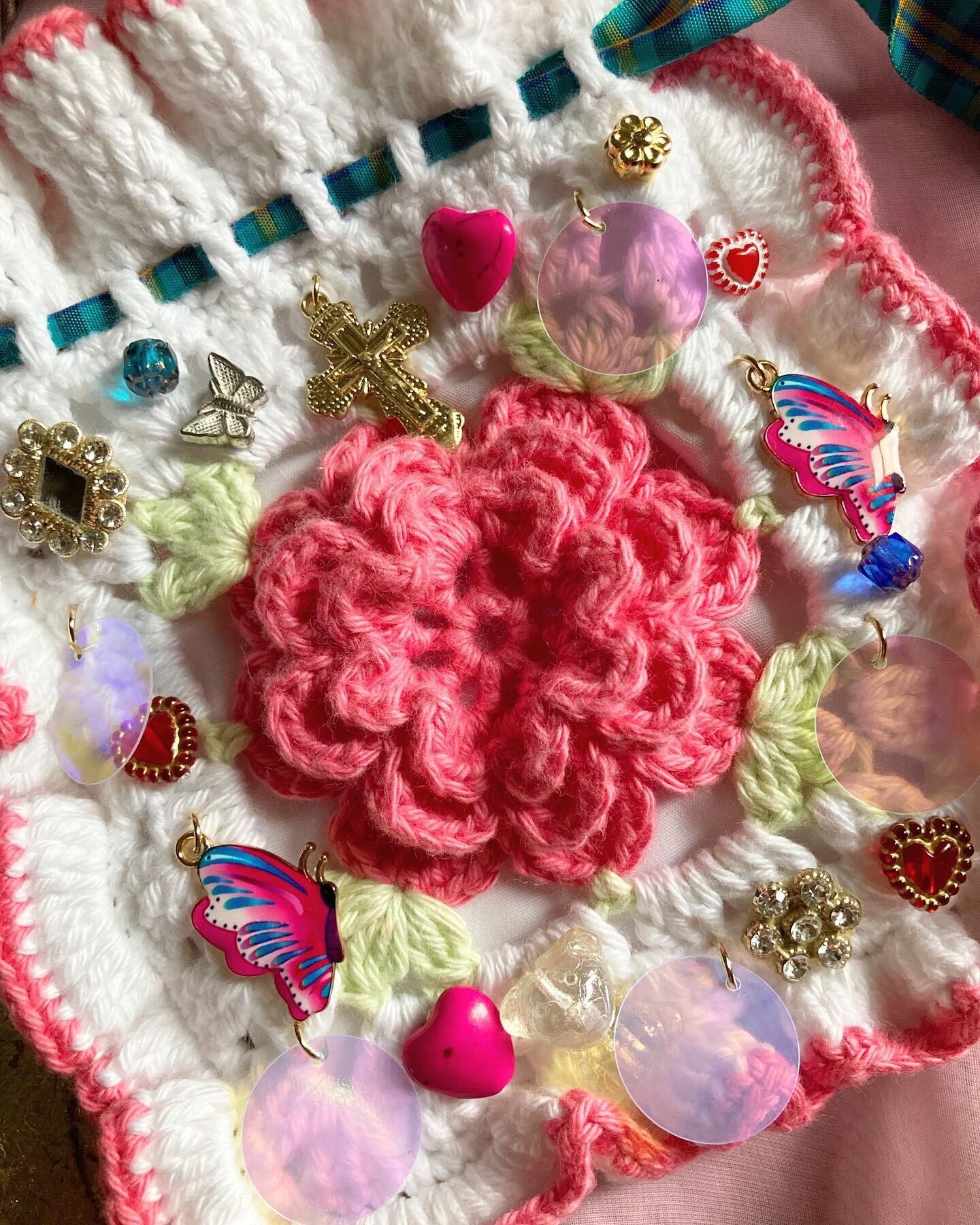meruri mii merryさんが手編みで編んだミニ巾着をAPOLIAが装飾させて頂きました。