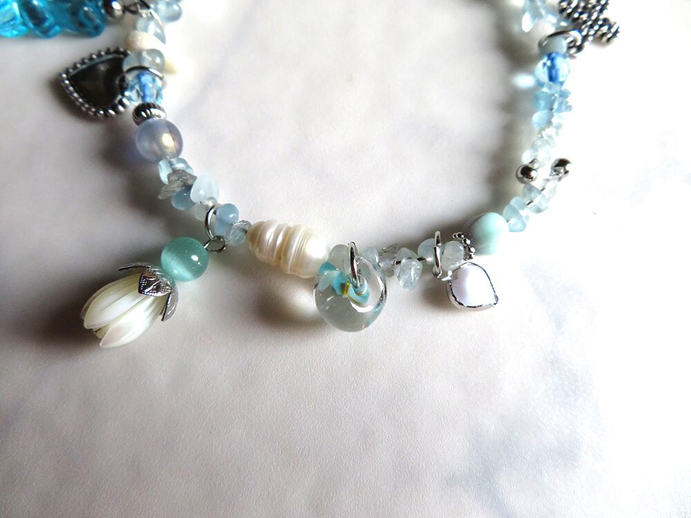 天然石や淡水パール、シェルビーズ、ハンドメイドのランプビーズ等を贅沢に使用した細身のブレスレット。