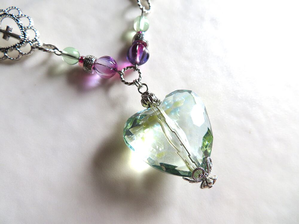 シルバーとクリア感が美しいリーフグリーン×イエローグラデーションのハートチャームを使用したボリューミーなネックレス。