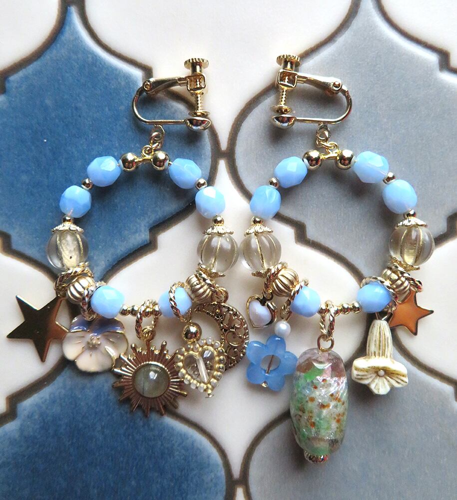チェコビーズのフープにハンドメイドのランプビーズやチャームがアシンメトリーに贅沢に垂れる、APOLIAらしい異国情緒たっぷりのデザインです。