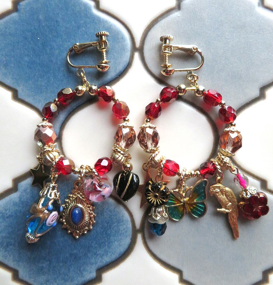 チェコビーズのフープにハンドメイドのランプビーズやチャームがアシンメトリーに贅沢に垂れる、APOLIAらしい異国情緒たっぷりのデザインです。