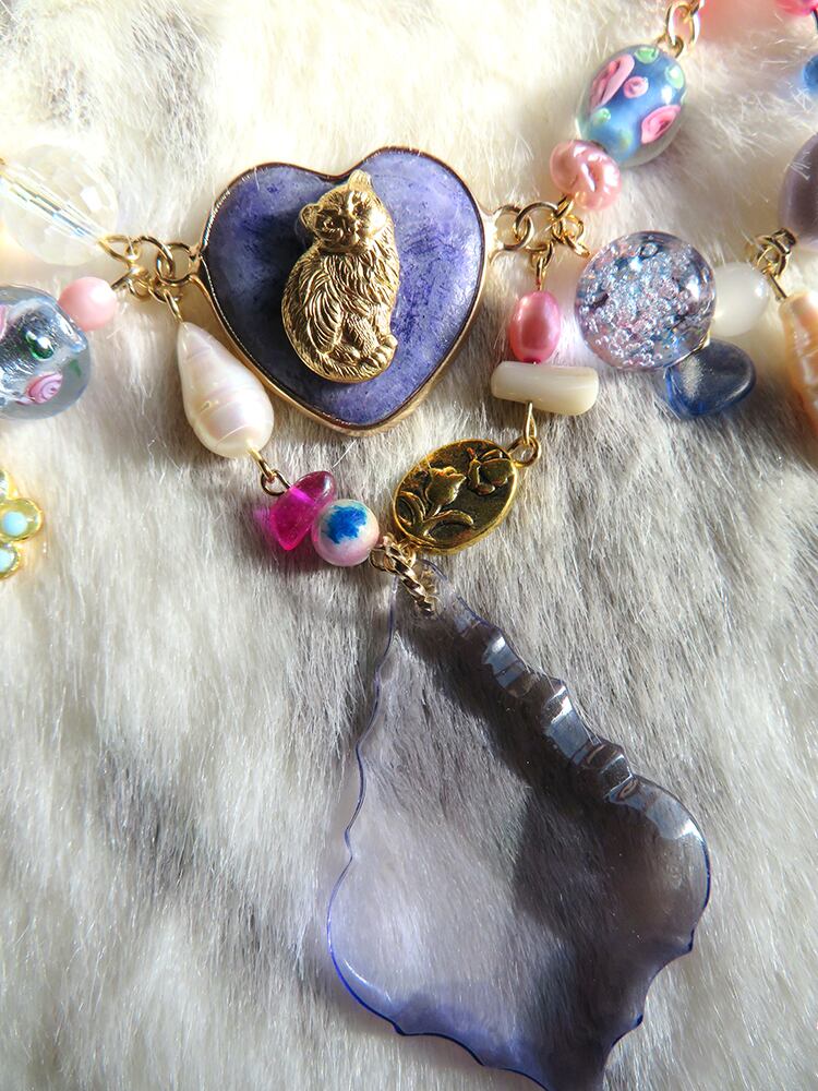 高貴な菫色のクッションに鎮座する猫ちゃん。紫、ピンク、水色のpopでfancyなカラーを、大人になった少女にぴったりな落ち着きと遊び心を含めて制作しました。