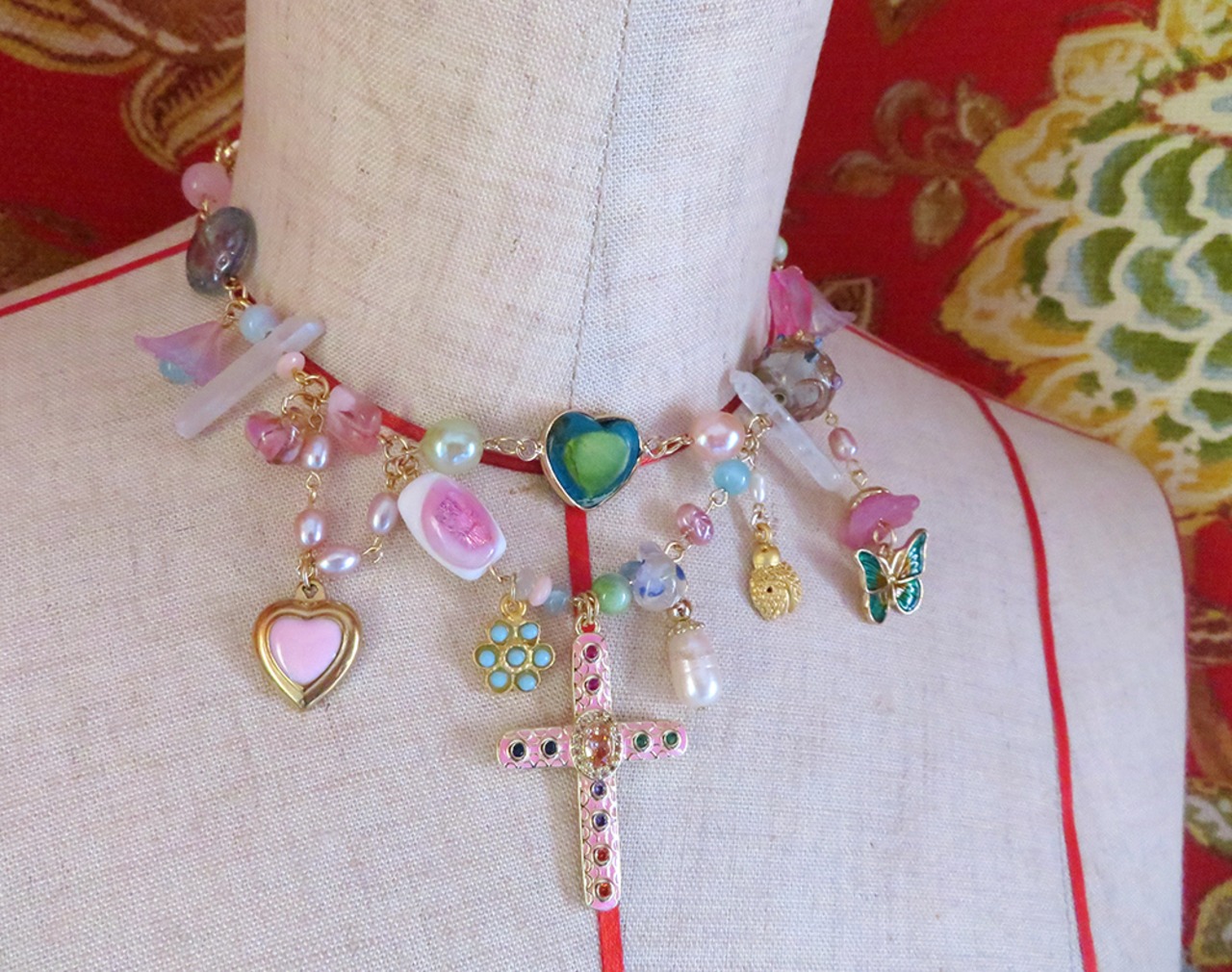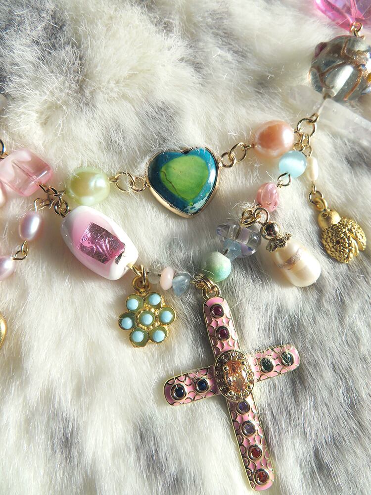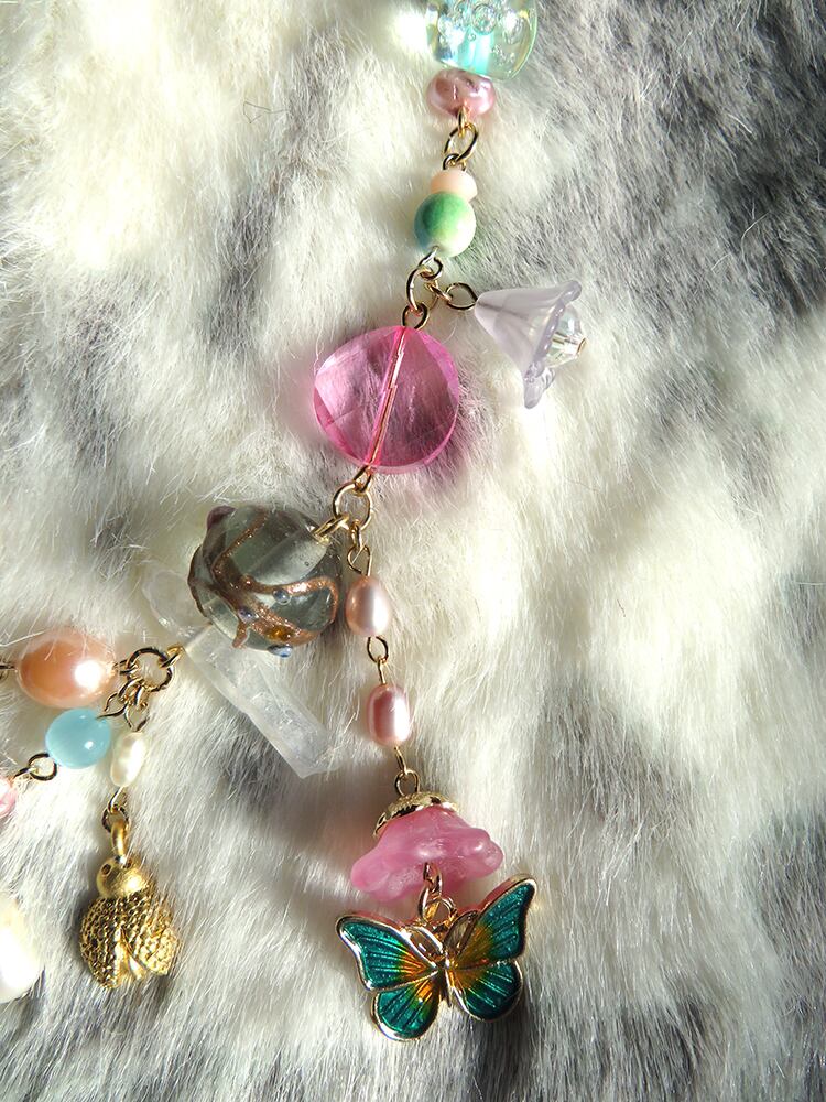 トルコ製の天道虫や花チャームが揺れる、パステルカラーの花園。ハンドメイドのランプビーズや人口水晶が作品全体に瑞々しい雰囲気を降らせてくれています。