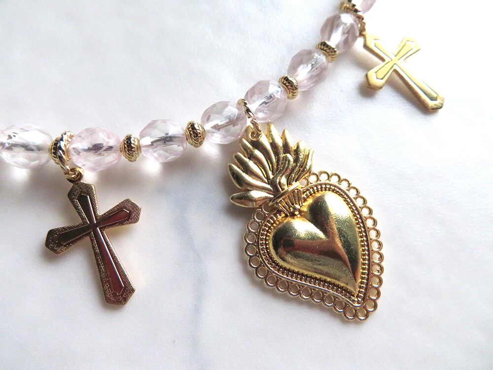 こちらはゴールドベースに薄いミルキーピンクのチェコビーズを組んだデザインです。