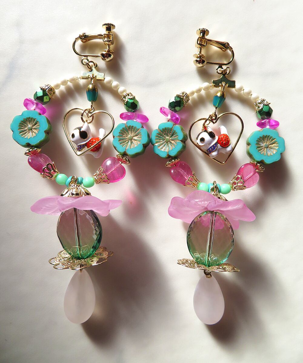 ピンクの大きな花パーツの下のビーズは、写真だとわかりにくいですがピンク〜グリーンの綺麗なグラデーションビーズです。