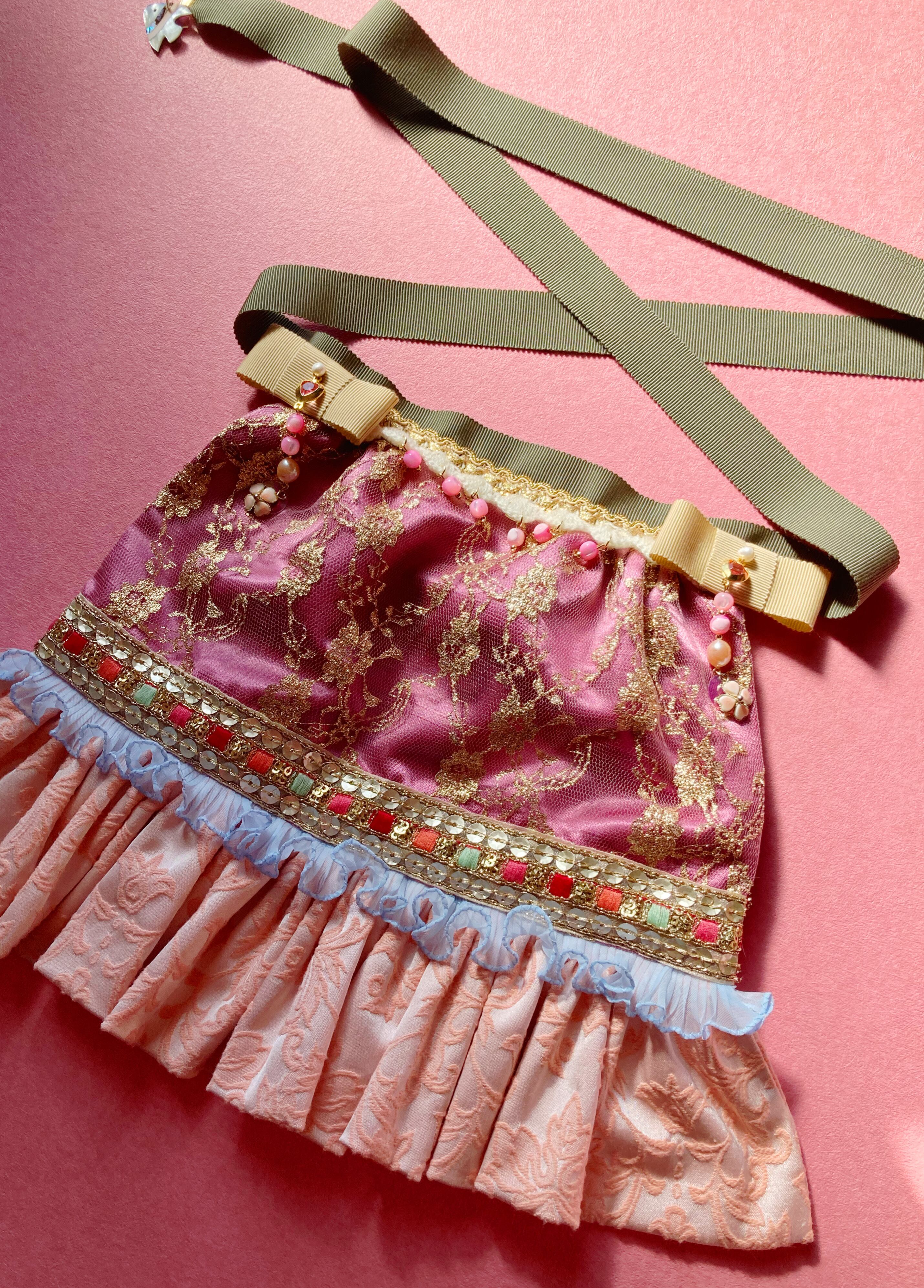 ラメレース生地やインドの刺繍リボンなどを使用し、闘魚の角度によって変化する美しさを表現しました。たっぷりととったフリルは闘魚の尾ひれの様。