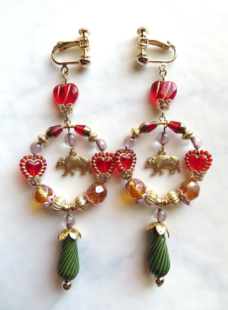 珍しいリアルなディティールの熊チャームが可愛い耳飾り。サーカスの幕が開いて玉乗りをしているイメージで制作しました。