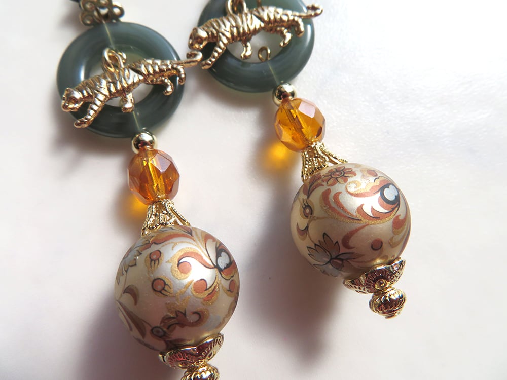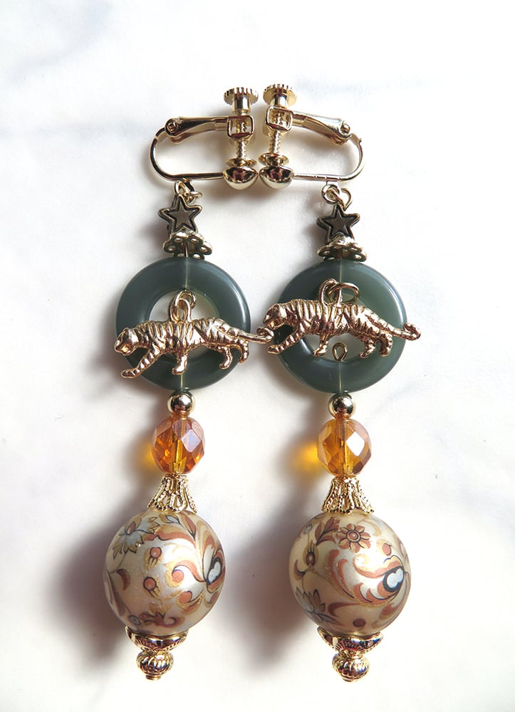 輪くぐりをする虎をイメージしたデザイン。マットな質感の球ビーズが落ち着いた印象をもたらしてくれます。