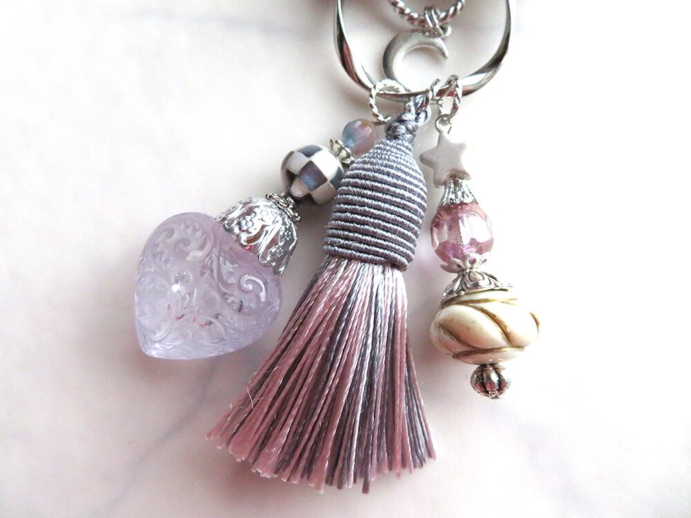 ONISさんの人にも花にも優しい、レジンを使わない本革と押花で制作された蝶モチーフに合わせて、APOLIAがひとつひとつビーズ等でサーカスチャームを組んでバッグチャームに仕上げました
