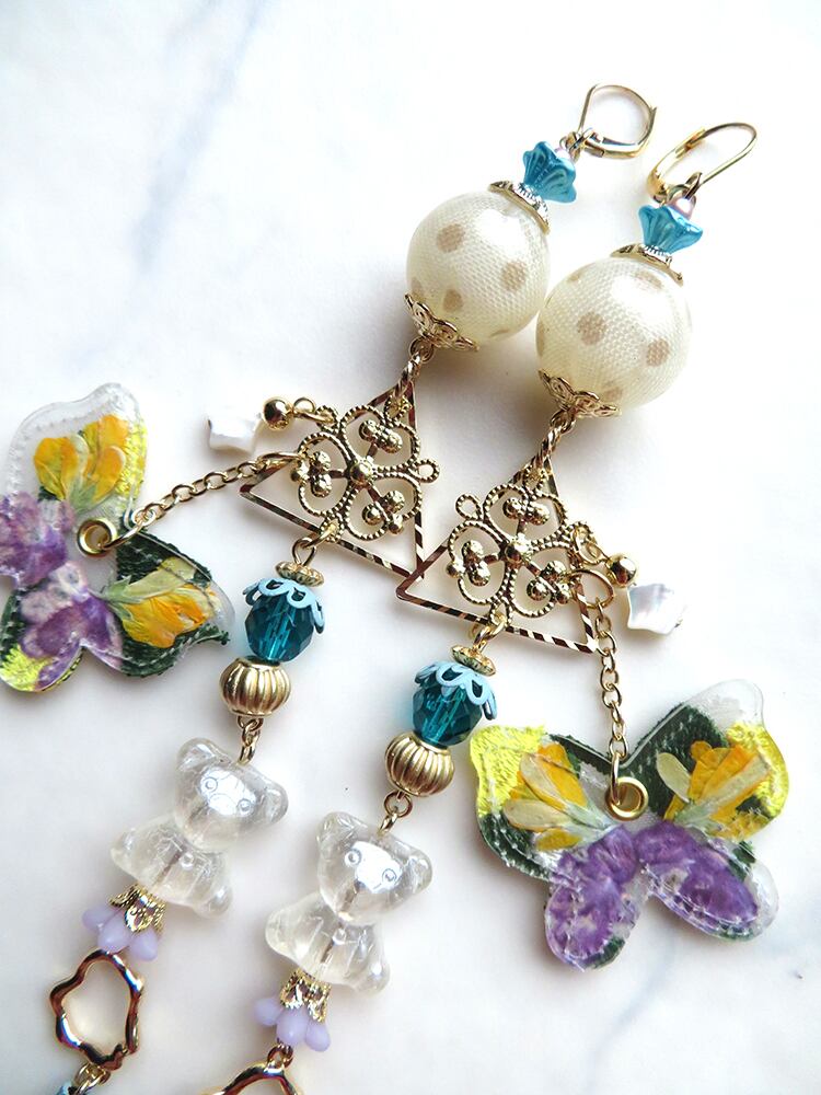 ONISさんの人にも花にも優しい、レジンを使わない本革と押花で制作されたモチーフに合わせて、APOLIAがロマンティックなサーカスマスクチェーンに仕上げました