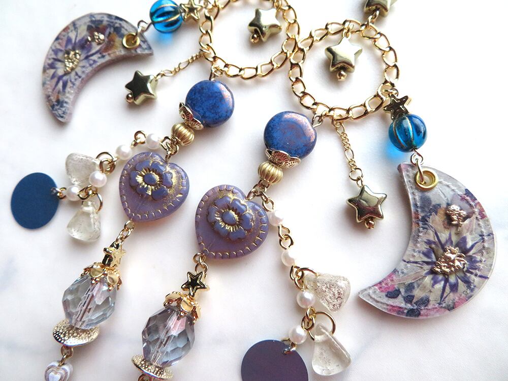 ONISさんの人にも花にも優しい、レジンを使わない本革と押花で制作されたモチーフに合わせて、APOLIAがロマンティックなサーカスマスクチェーンに仕上げました