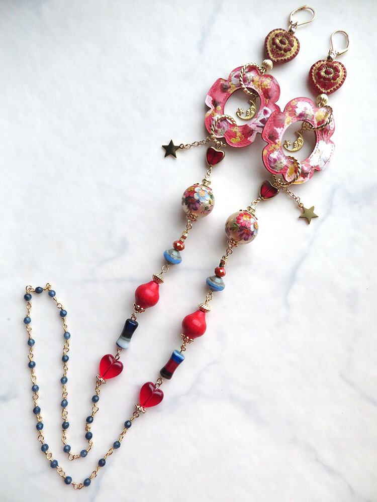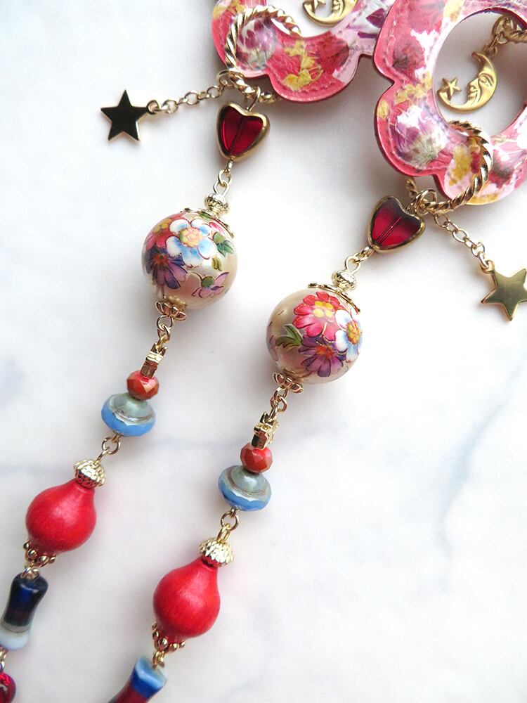 ONISさんの人にも花にも優しい、レジンを使わない本革と押花で制作されたモチーフに合わせて、APOLIAがロマンティックなサーカスマスクチェーンに仕上げました