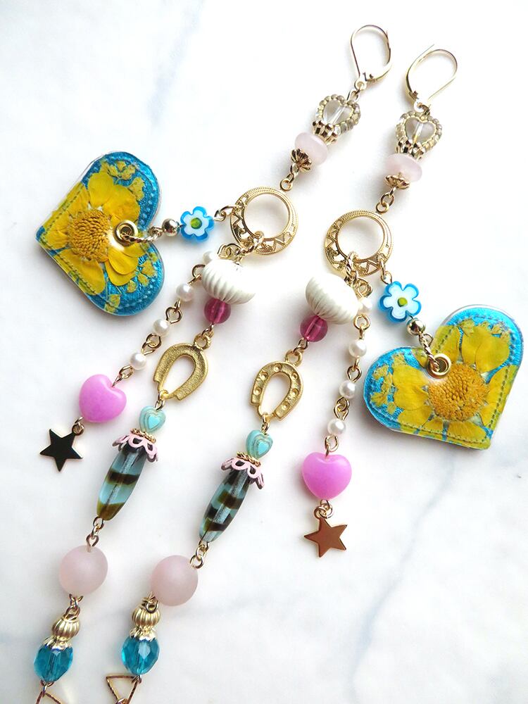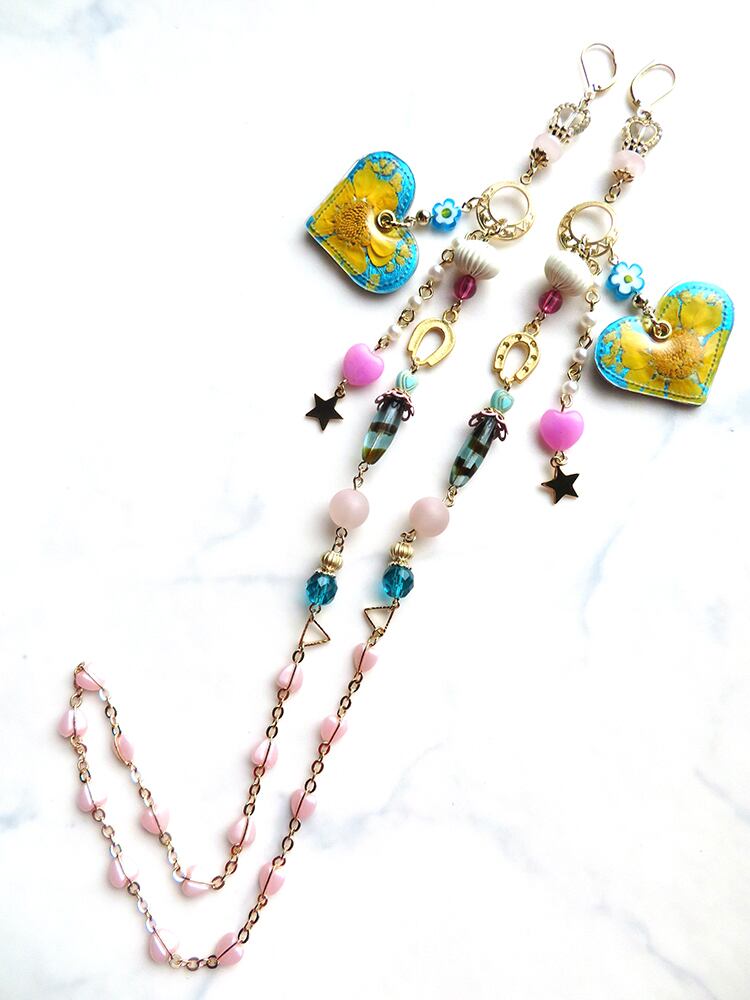 ONISさんの人にも花にも優しい、レジンを使わない本革と押花で制作されたモチーフに合わせて、APOLIAがロマンティックなサーカスマスクチェーンに仕上げました