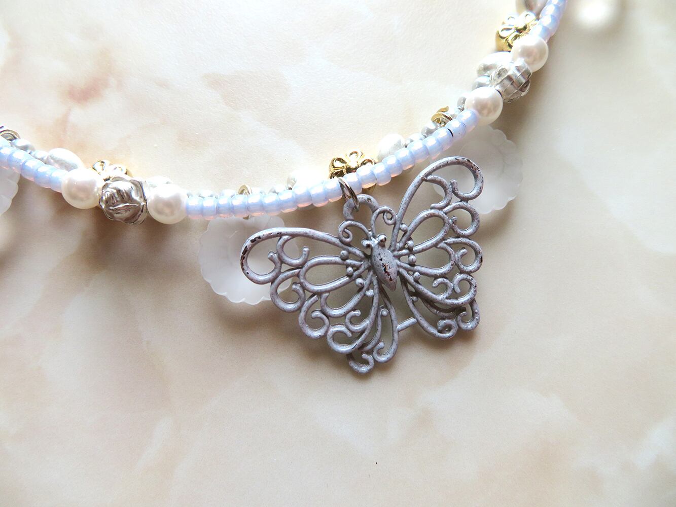 2つセットのビーズチョーカー。不思議な乳白色のライラックカラーのビーズにヴィンテージ感のある塗装を施された蝶々がニューロマンティックヴィンテージスタイルでとても可愛いです。