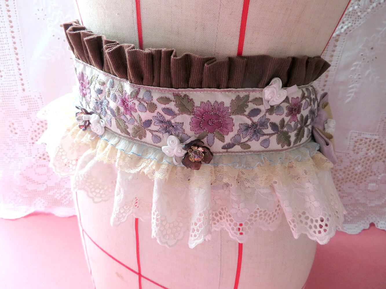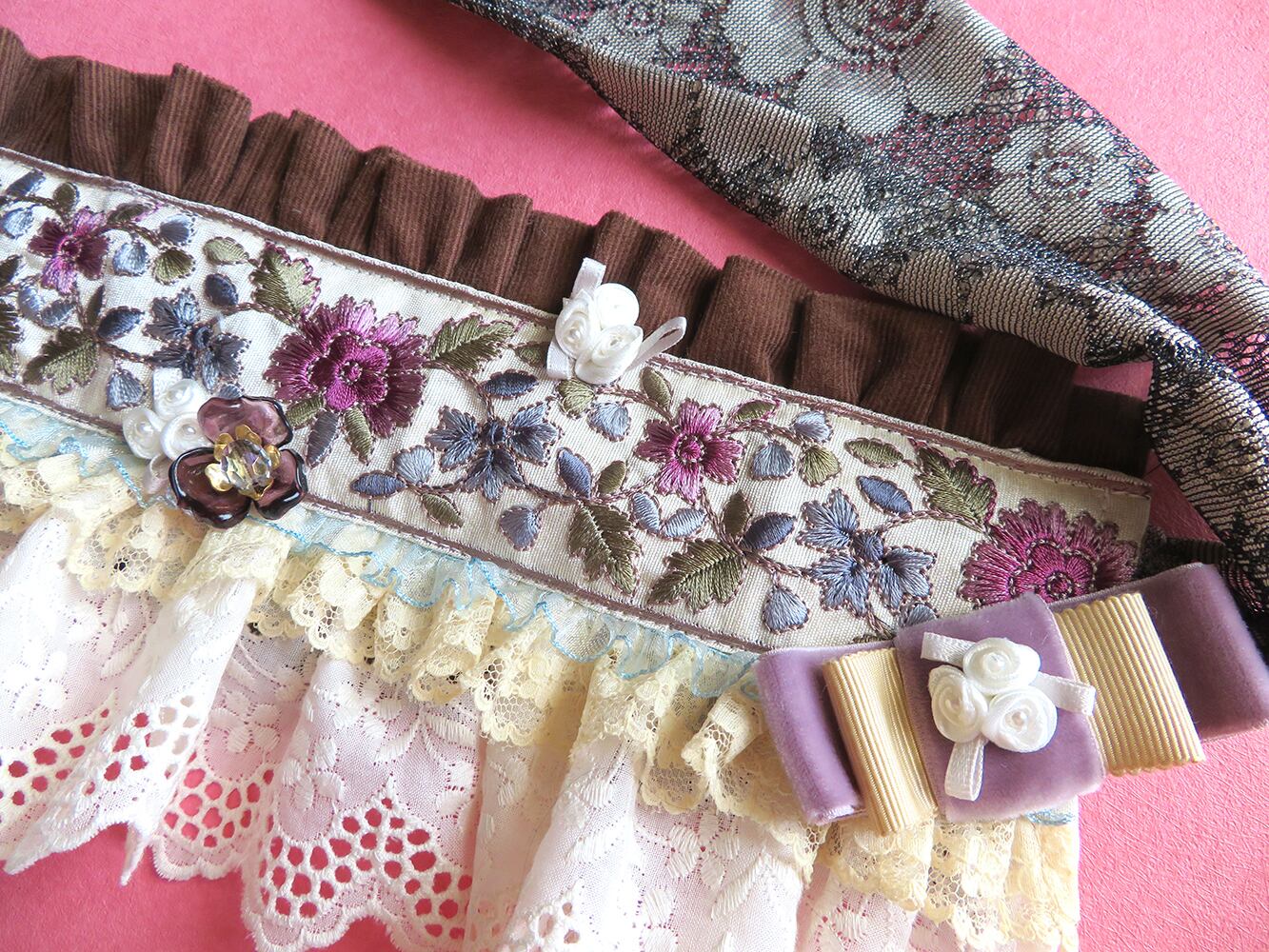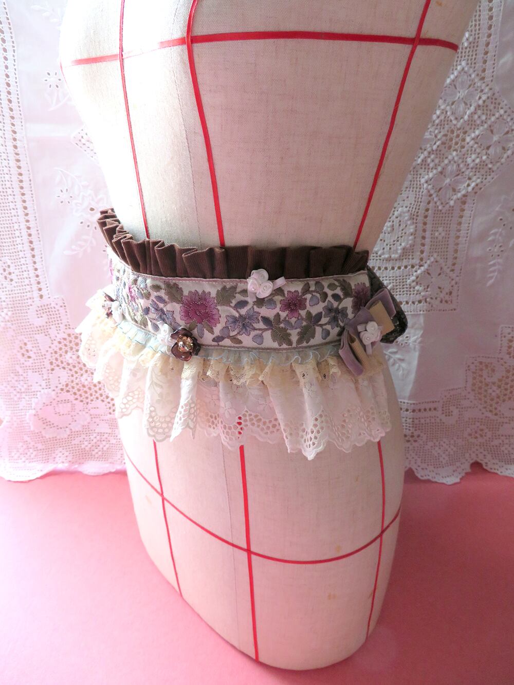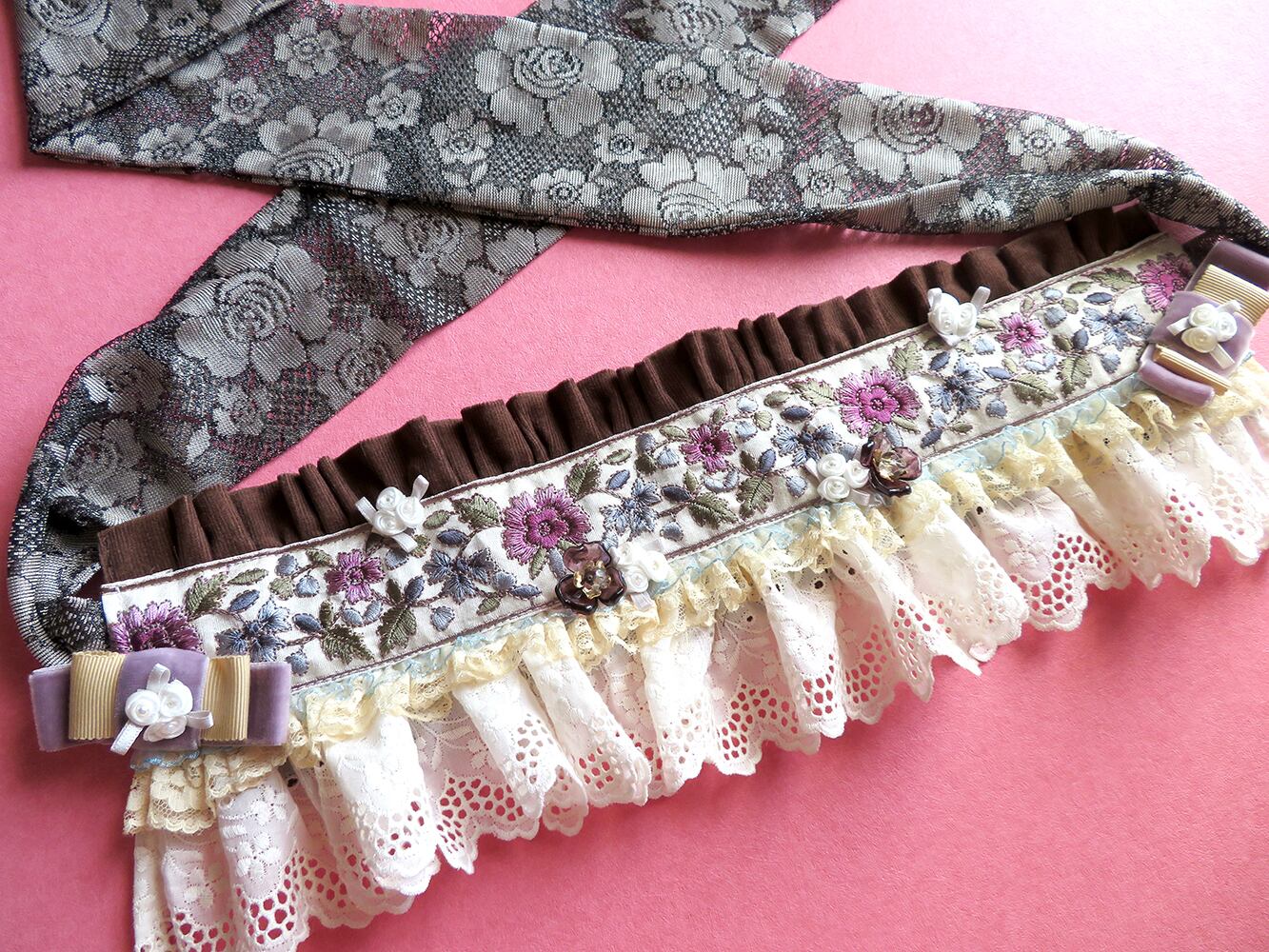 刺繍リボンをあしらった、着物の帯のようなフリルベルト。後ろはりぼんで結ぶ形です。また、顎下でりぼんを結んで頂くとヘッドドレスにもなる2way仕様となります。