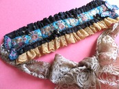 クラシカルなデザインにグレーの花柄のレースりぼんを合わせました。ヘッドドレスにすると甘い生成の綿レースと大人っぽいグレーのりぼんのバランスが◎