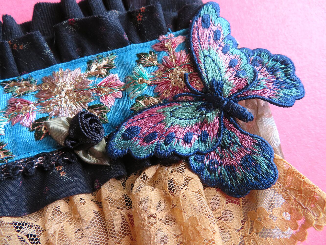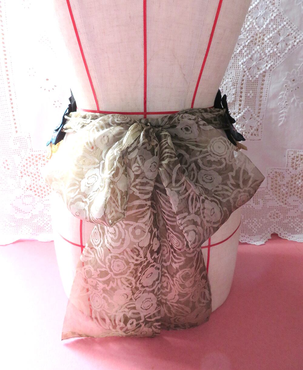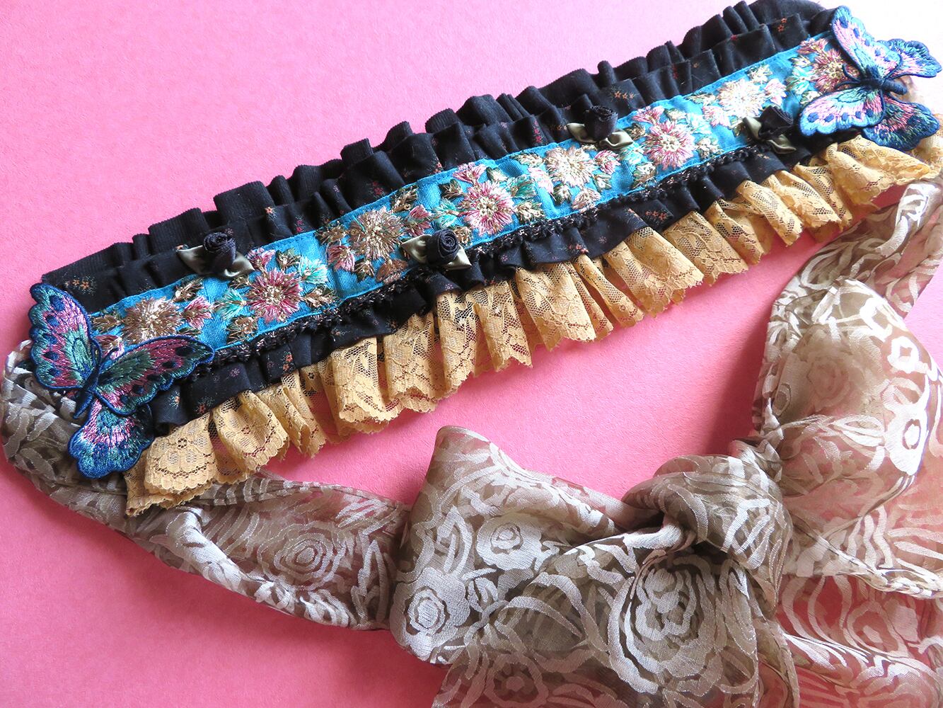 刺繍リボンをあしらった、着物の帯のようなフリルベルト。後ろはりぼんで結ぶ形です。また、顎下でりぼんを結んで頂くとヘッドドレスにもなる2way仕様となります。
