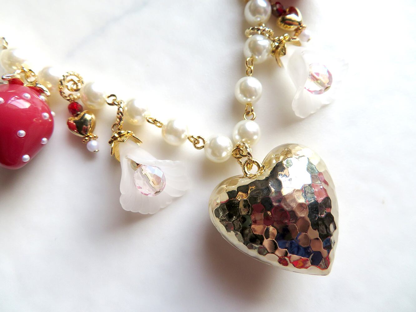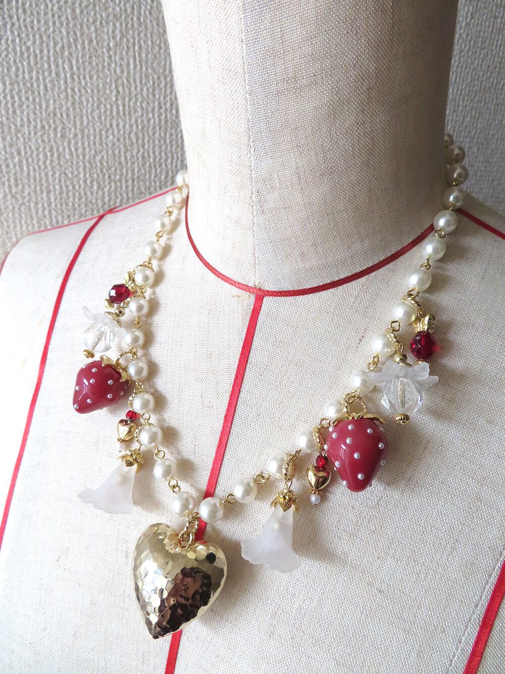 大きな苺とハートのチャームが可愛い、思わずピクニックに出かけたくなるネックレス。