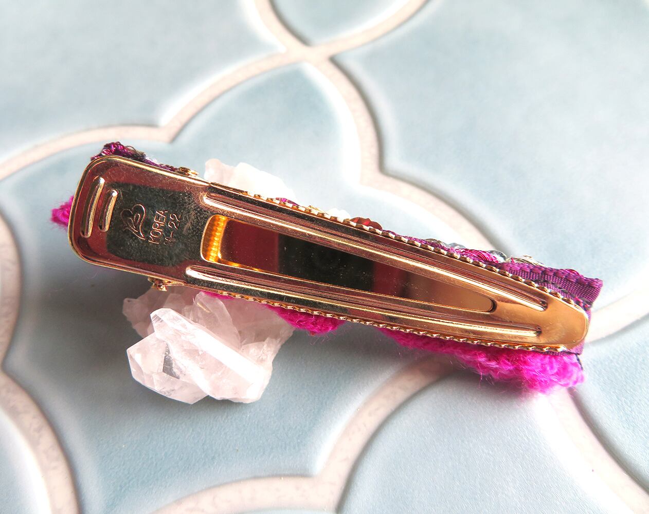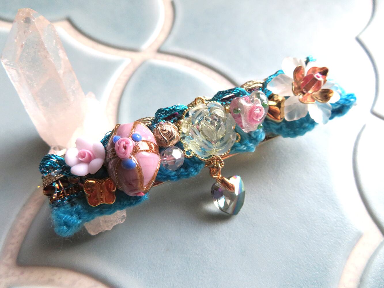 エキゾチックなブレードに長い時を経て海底で眠っていた宝石の様なビーズやチャームを刺繍して、ヘアクリップに仕上げました。髪に挟むだけで華やかな雰囲気を演出してくれるデザインです。