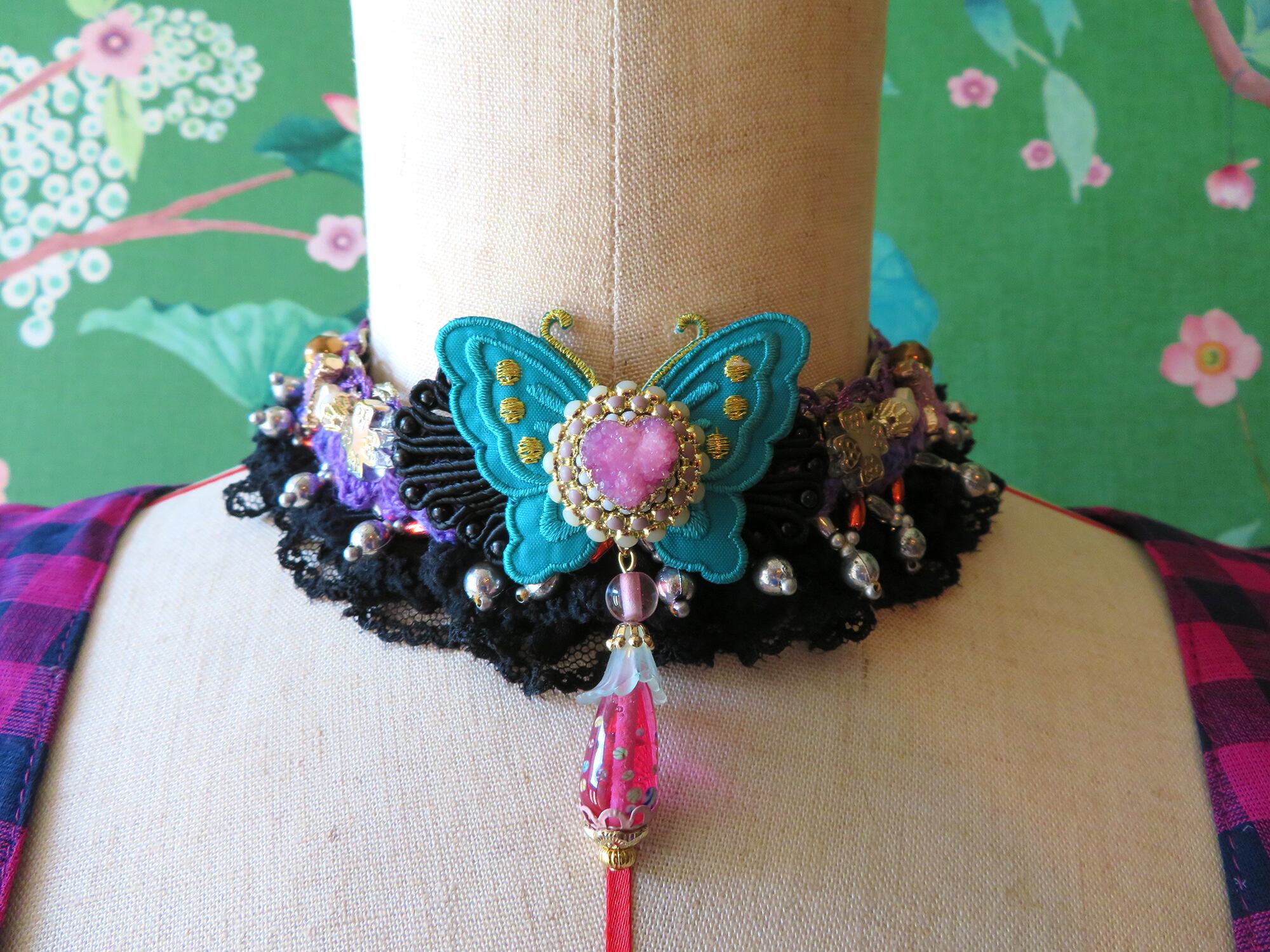 闘魚の尾ひれの様なボリュームあるフリルとカラー、エキゾチックガーデンにゆらゆらを舞う天然石の蝶々をお楽しみください。