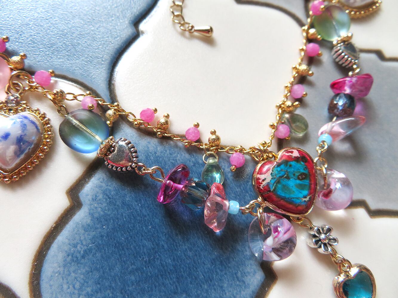 アメリカ製のハンドメイド吹きガラスビーズや染め細石、チェコ硝子ビーズなどを使用しています。