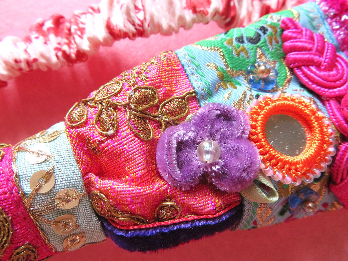 インド製の刺繍生地を土台に、海外製、日本製のリボンやビーズなどをコラージュして製作しました。