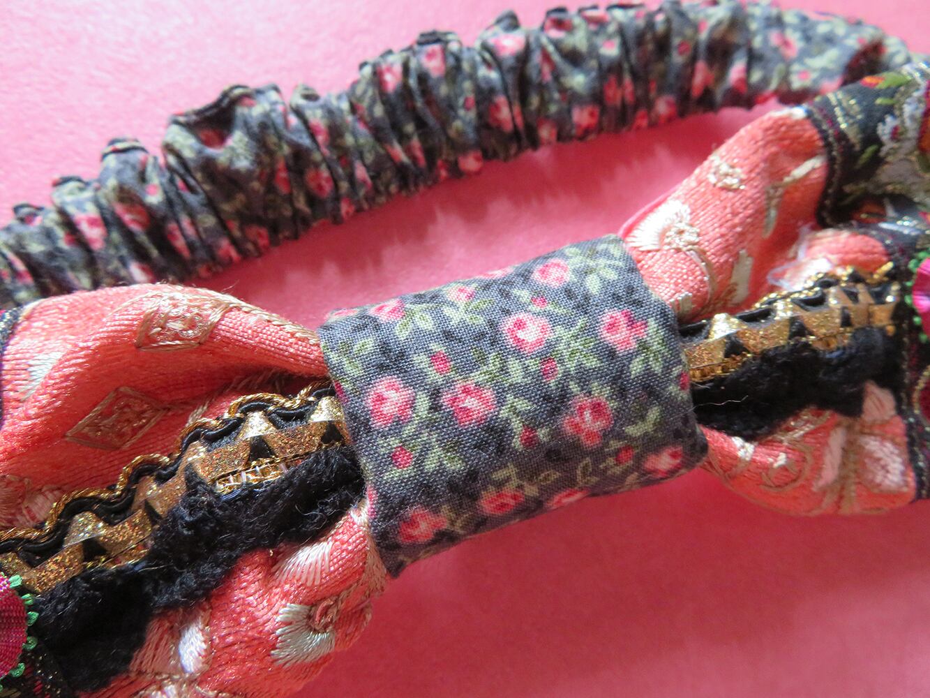 インド製の刺繍生地を土台に、海外製、日本製のリボンやビーズなどをコラージュして製作しました。