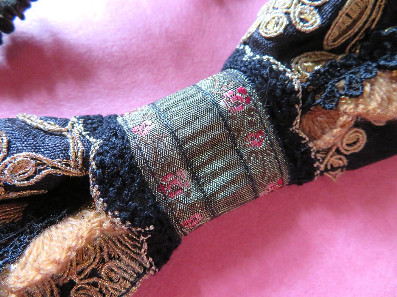 インド製の刺繍生地を土台に、海外製、日本製のリボンやビーズなどをコラージュして製作しました。