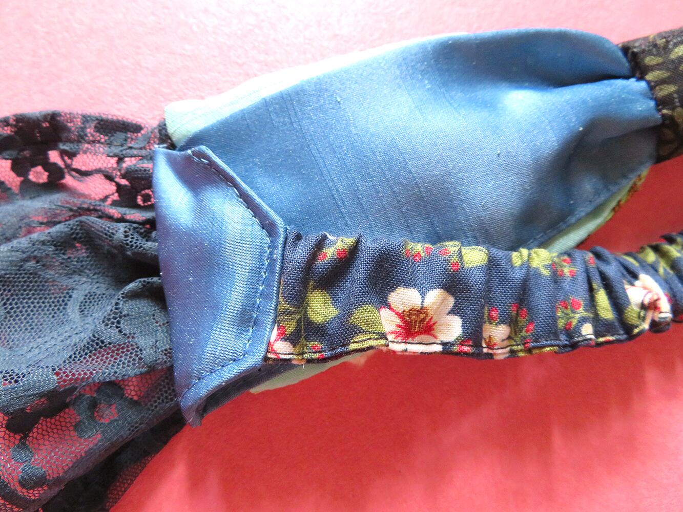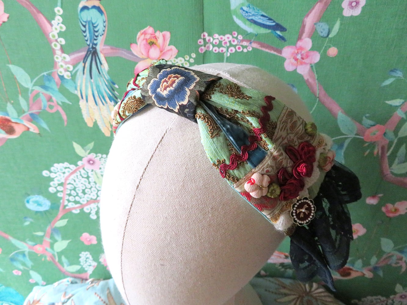 リボン型ですが薄く土台に直接縫い留めているので頭にフィットしターバンの様なシルエットになります。