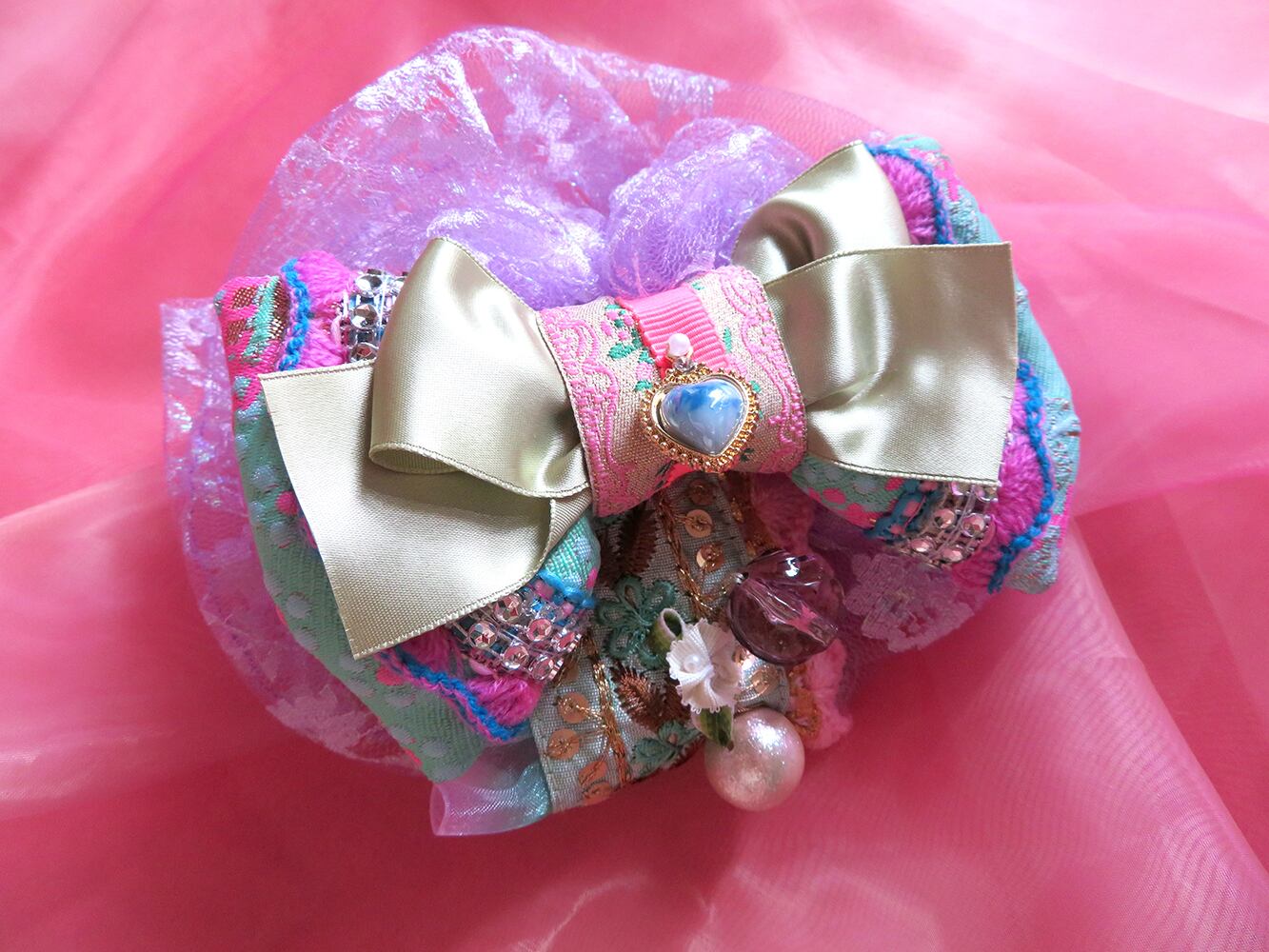 大きなリボンの反対側には、ジェリーポンチに浮かぶゼリーなどをイメージした大ぶりのビーズを縫い留めています。