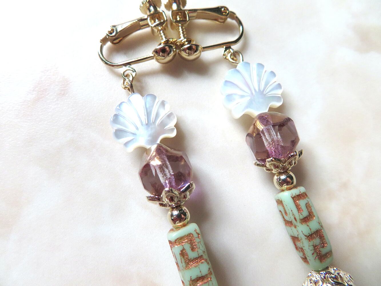 貝型のシェルビーズとアジアンなデザインのチェコビーズの組み合わせが可愛いシノワズリなデザインです。