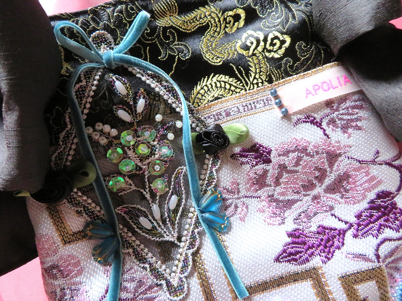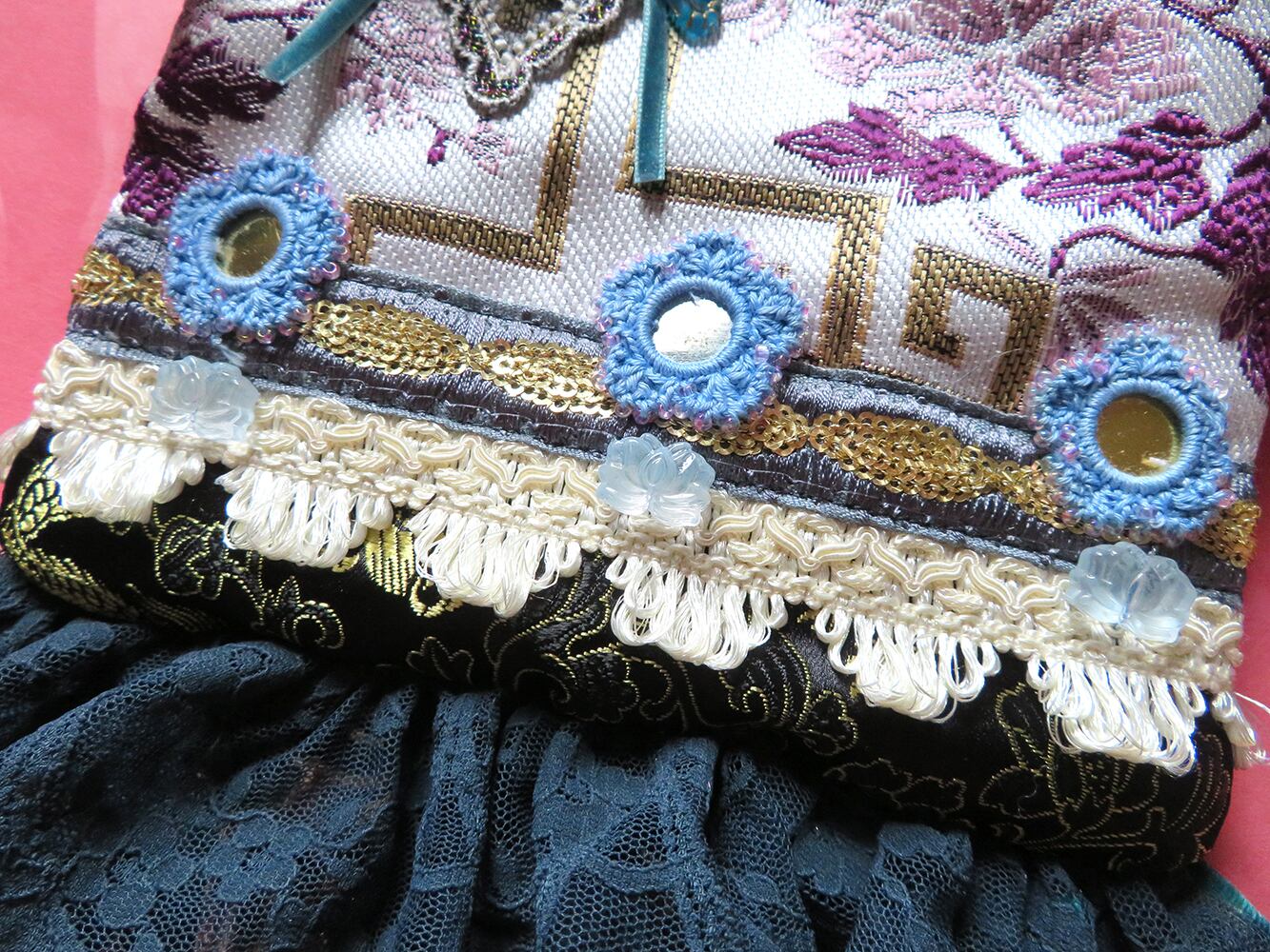 様々な国で作られた素材を旅の記録の様にコラージュして縫い留めました。