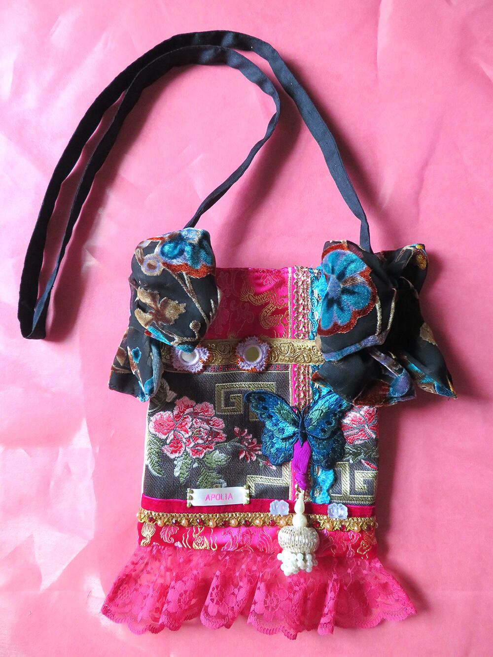 様々な国で作られた素材を旅の記録の様にコラージュして縫い留めました。